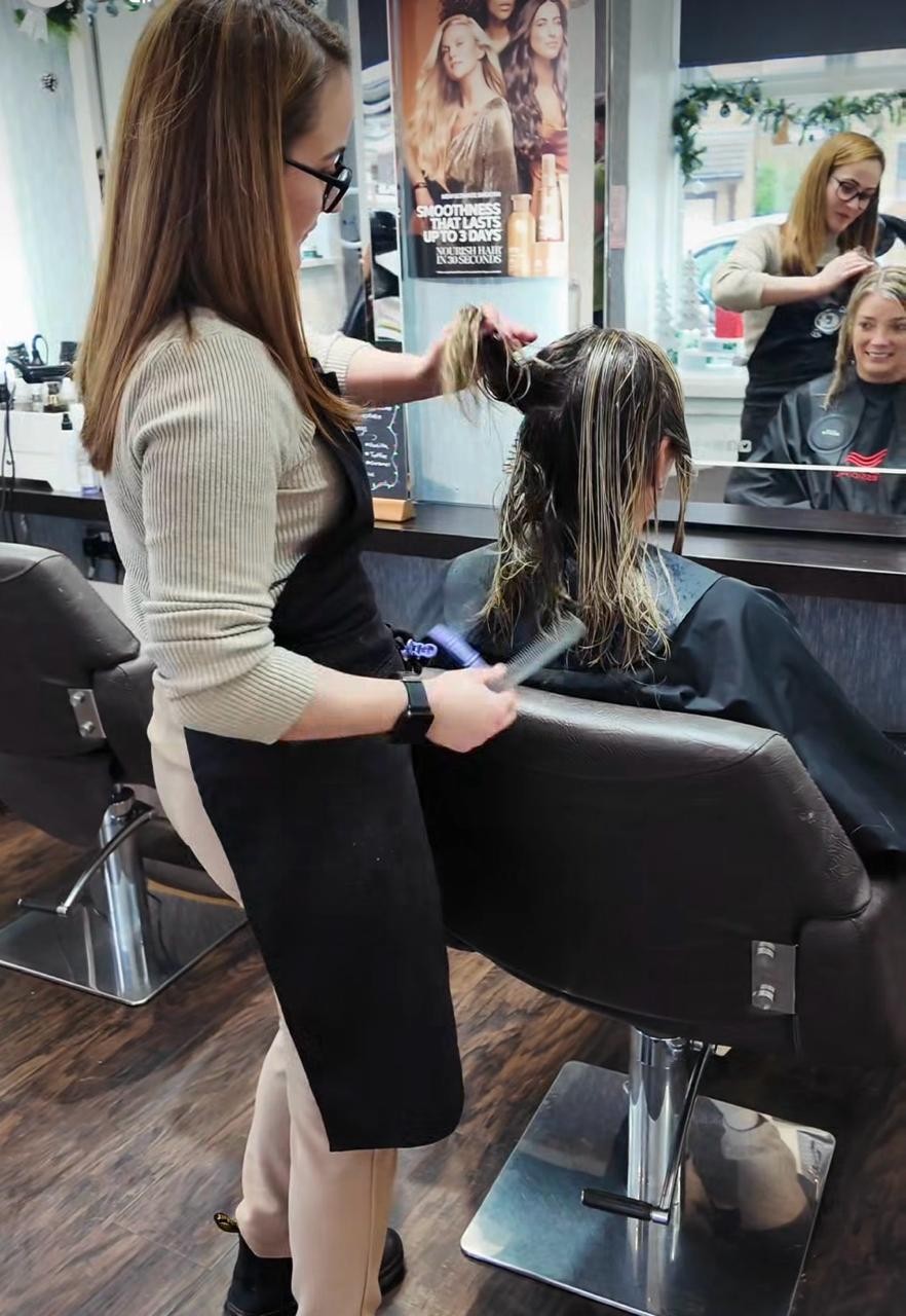I began training at Wella HQ the week after leaving school and have completed a wide range of courses since. I’m a Wella Essentials Colour & Styling Graduate and have completed Expert Highlighting, Blonde, Colour Genius, and Balayage courses with Wella. I’ve also trained in nano bond, weave, and tape hair extensions, allowing me to offer a variety of modern styling and transformation services.